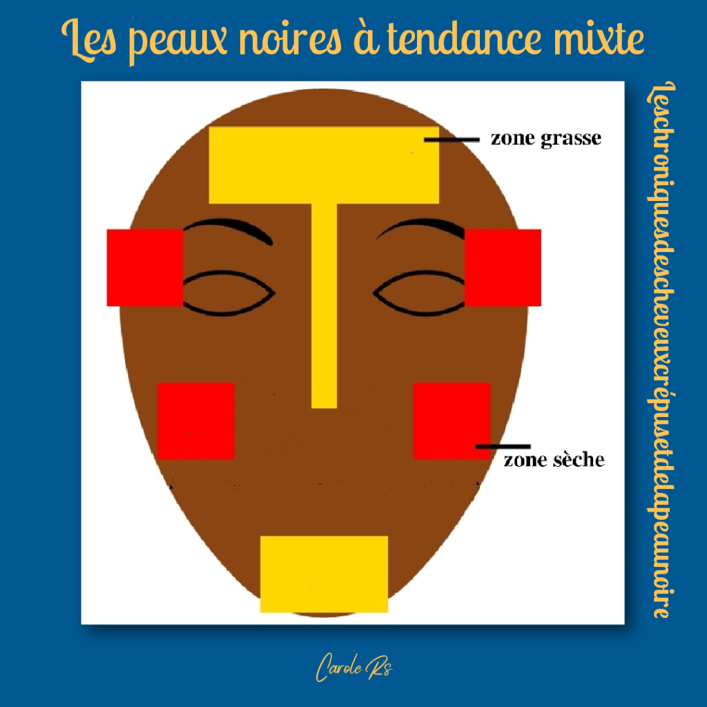 - les zones « grasses » sont localisées sur le front, le nez et le menton, appelée également zone « T »