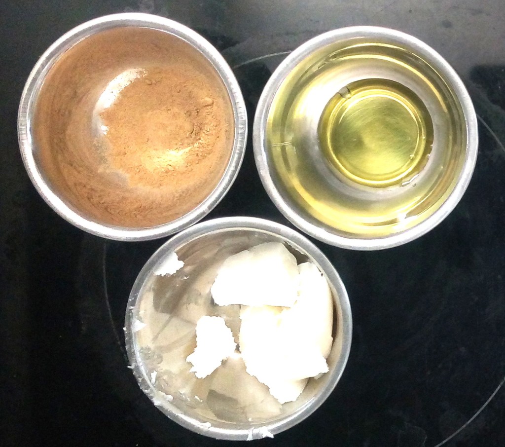 - une fois la base totalement fondue, hors du feu ajoute l’huile végétale et les plantes en poudre ou séchées tout en mélangeant après chaque ajout pour homogénéiser le mélange