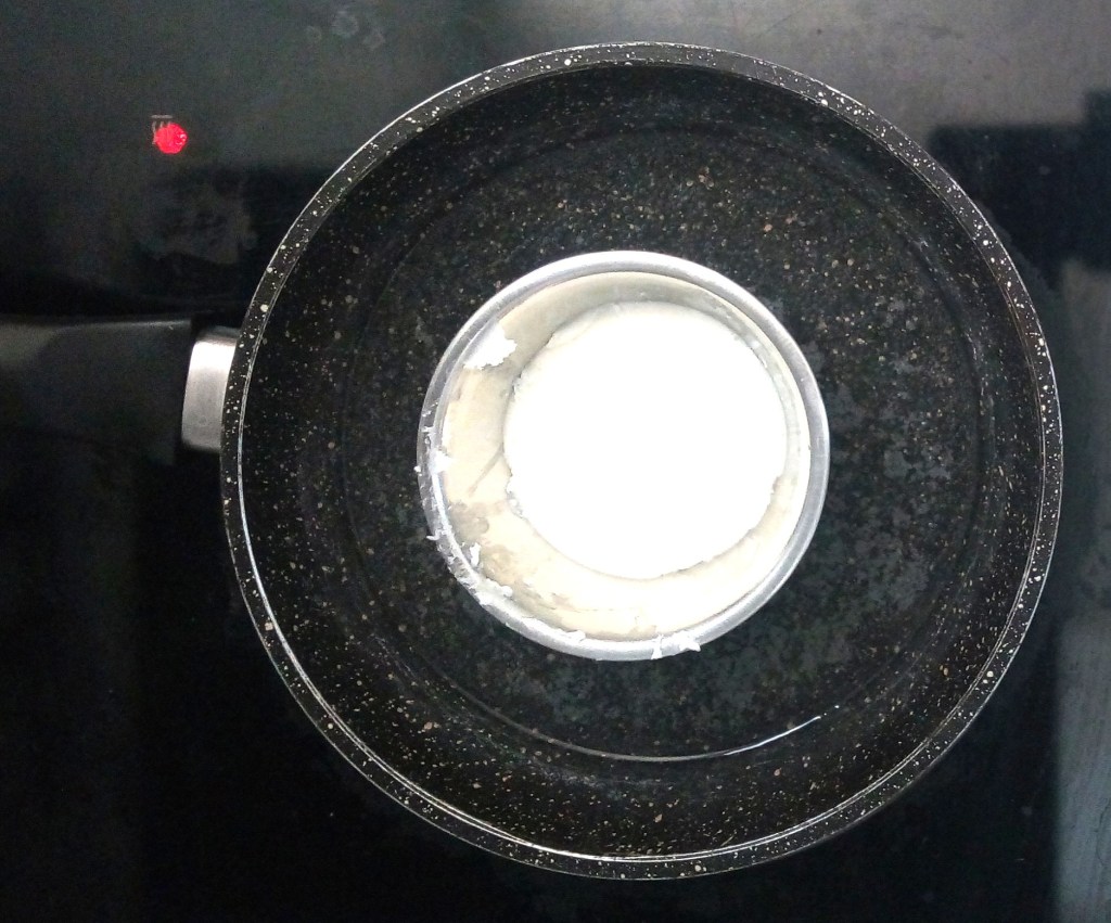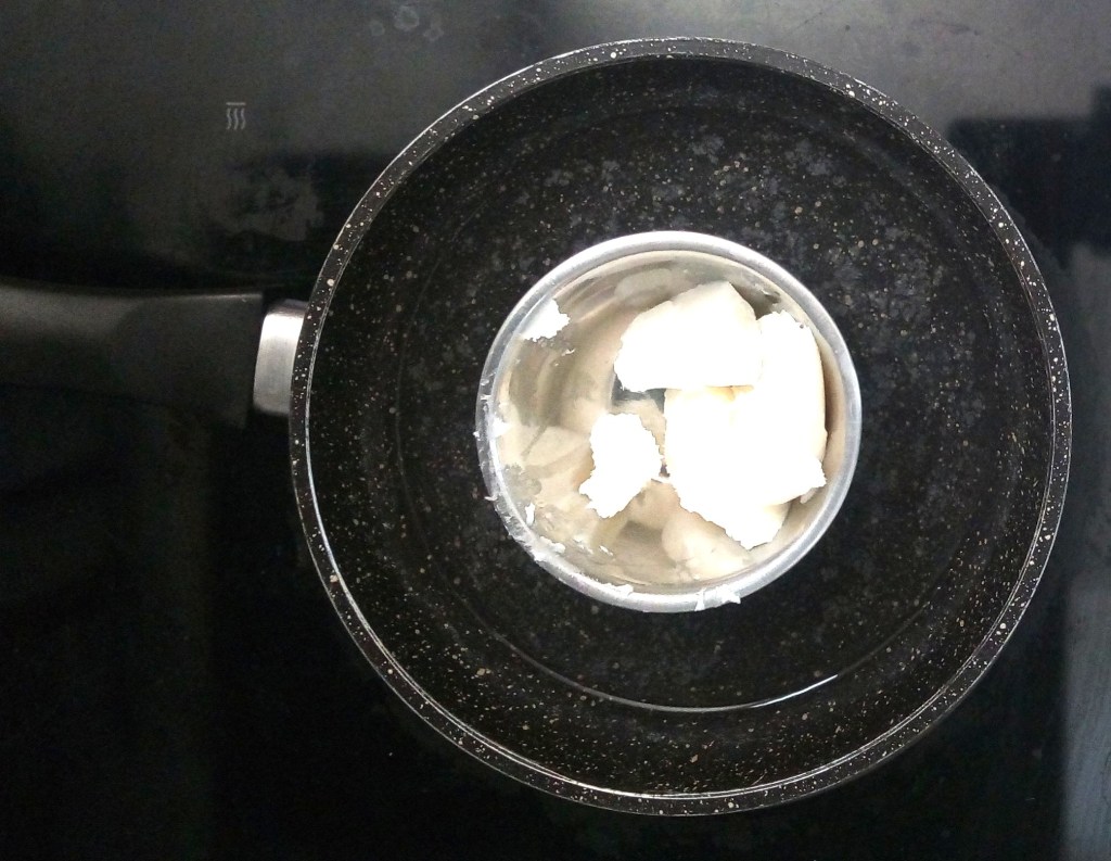 - mets le récipient contenant la base savon « melt and pour » à fondre au bain-marie