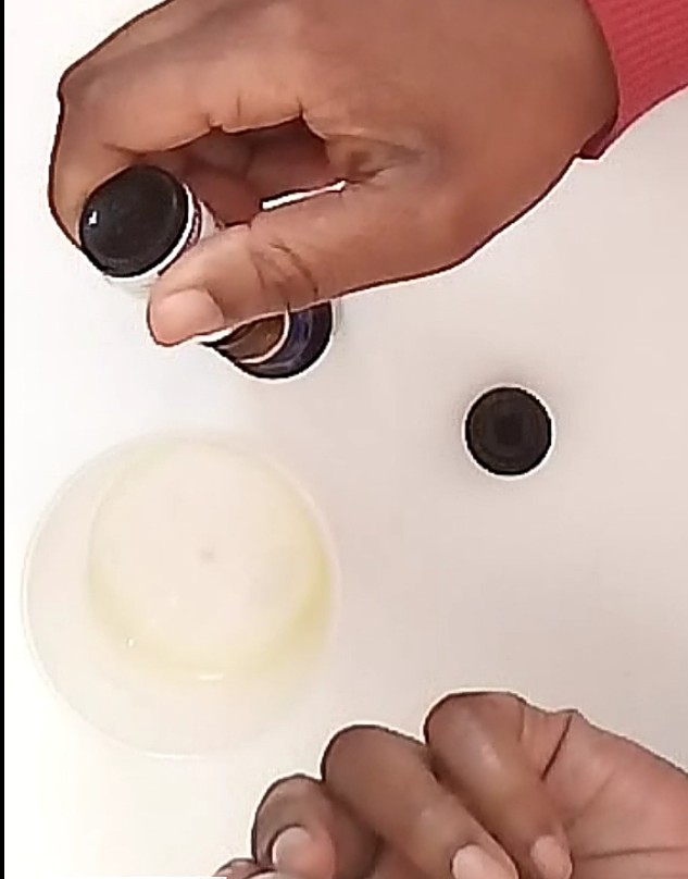- ajoute les 10 gouttes d’huile essentielle, mélange entre chaque ajout