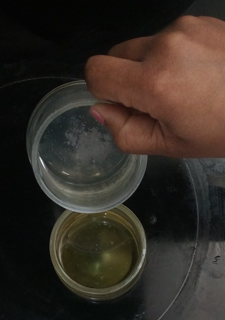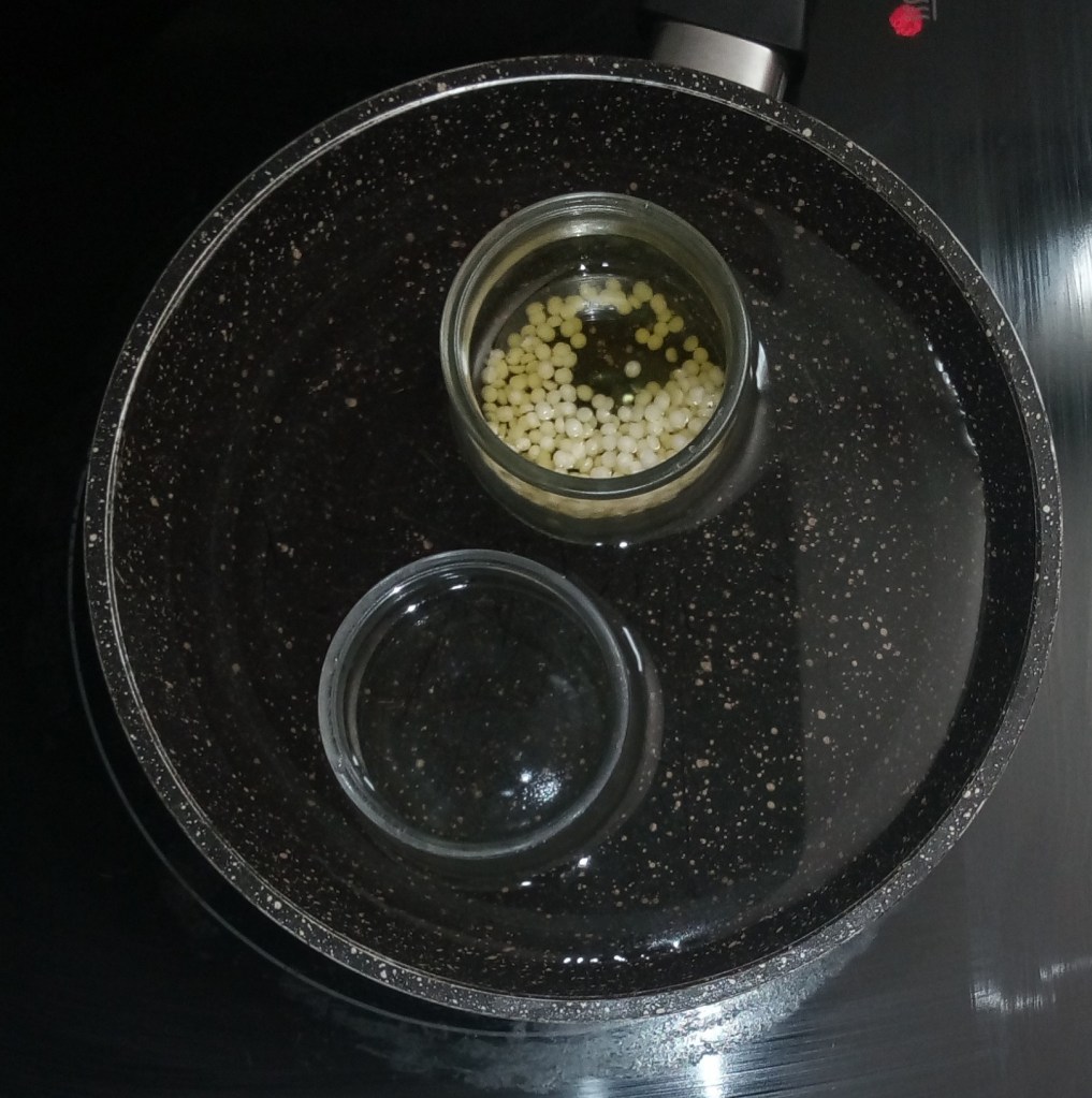 - mets l’huile végétale + l’émulsifiant dans le même récipient, l’eau dans un autre et dépose-les dans la poêle