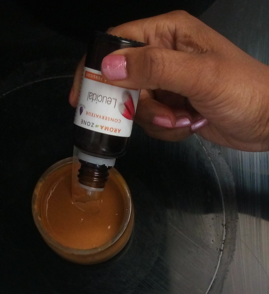 - ajoute les gouttes d’huile essentielle, puis le conservateur, mélange entre chaque ajout.