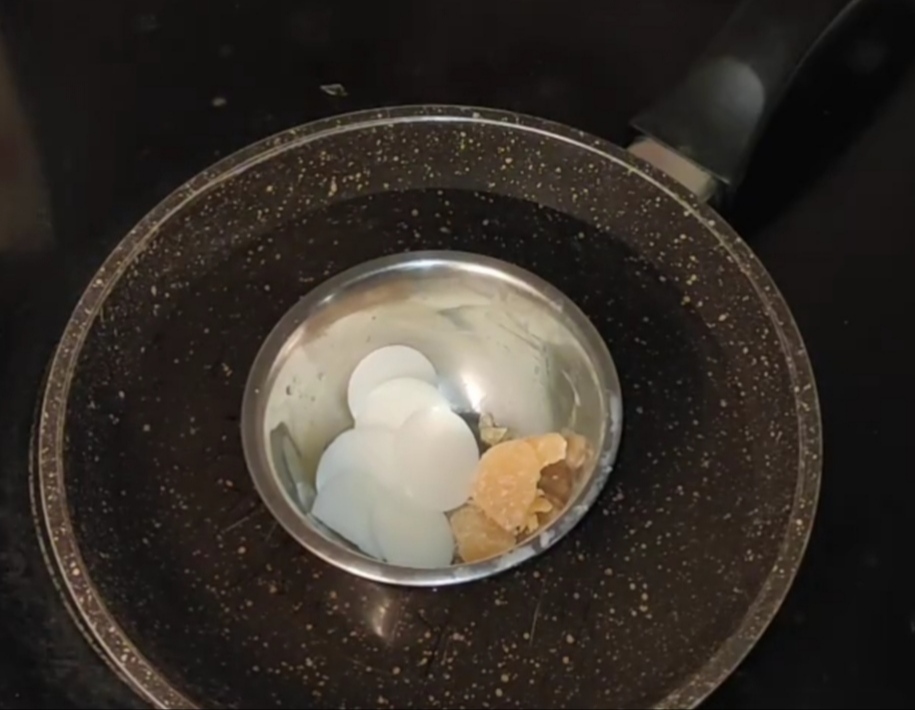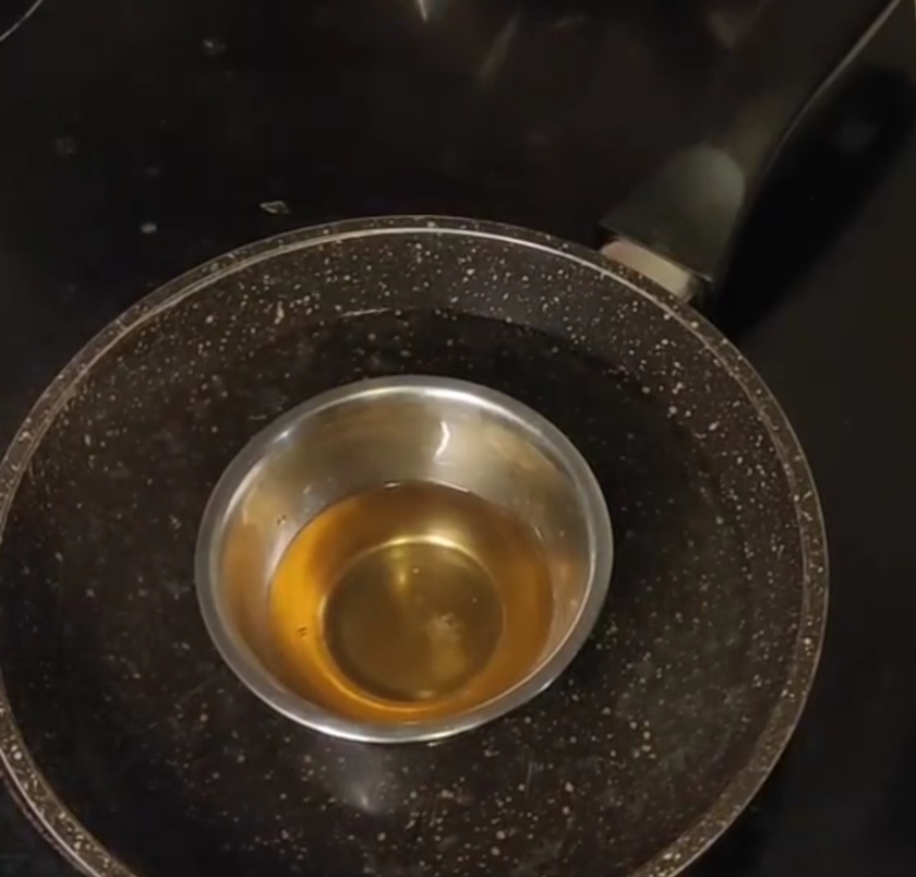 - mets le récipient qui résiste à la chaleur dans la poêle, fais-y fondre la cire d’abeille et le beurre de cacao